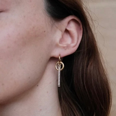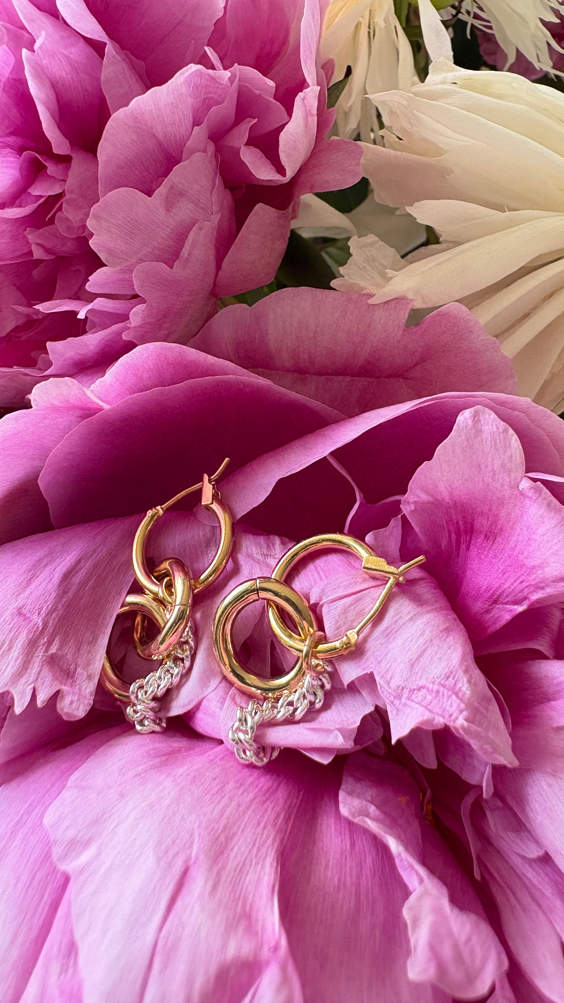 Laissez-vous tenter par les boucles d’oreilles Clémence : un design chic et moderne qui booste n’importe quelle tenue. Avec leurs anneaux dorés joliment entrelacés et leur fine chaîne argentée qui bouge au rythme de vos gestes, elles mixent avec style audace et simplicité.