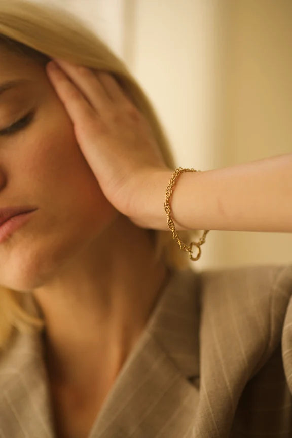 Immerse yourself in the luxurious world of Anne Thomas with the Margaret bracelet. Inspired by vintage pieces, it combines sophistication and modernity with its fine gold chain and textured links. The perfect accessory for a touch of charm and timeless elegance. Available as a matching necklace and ring.