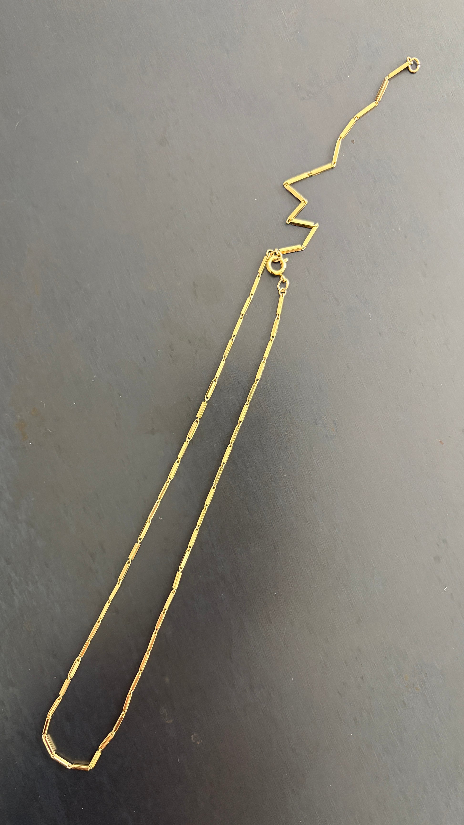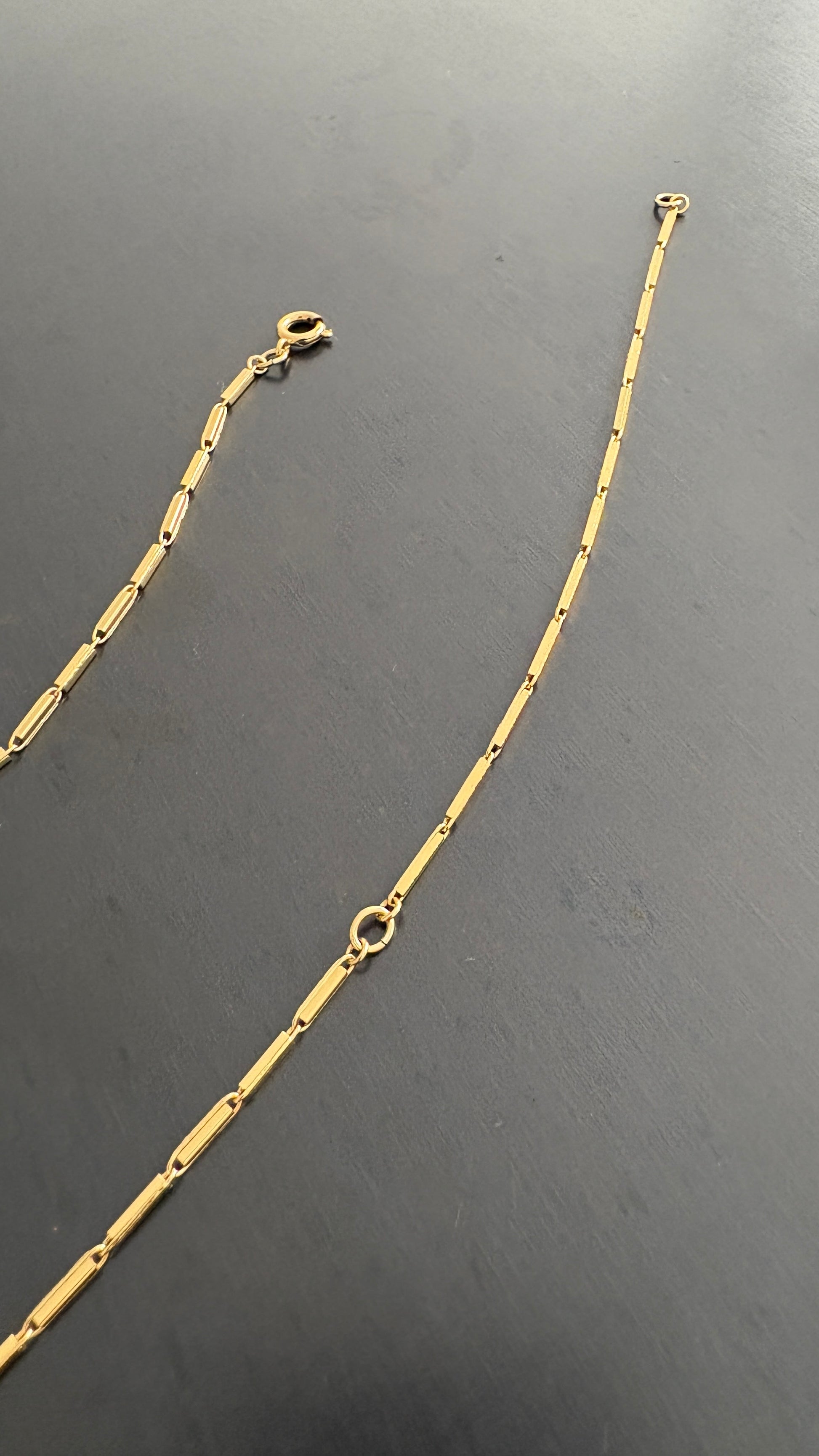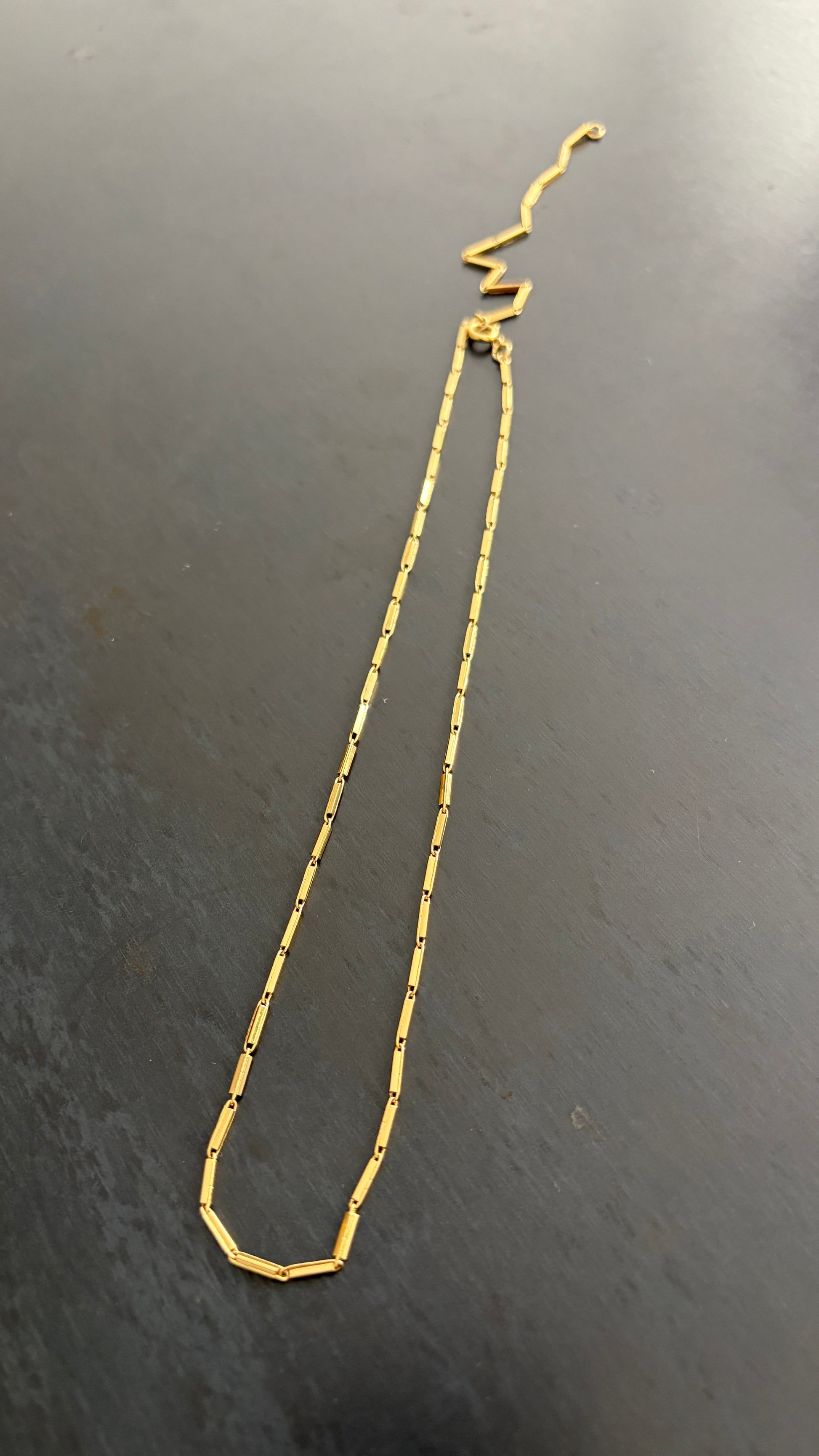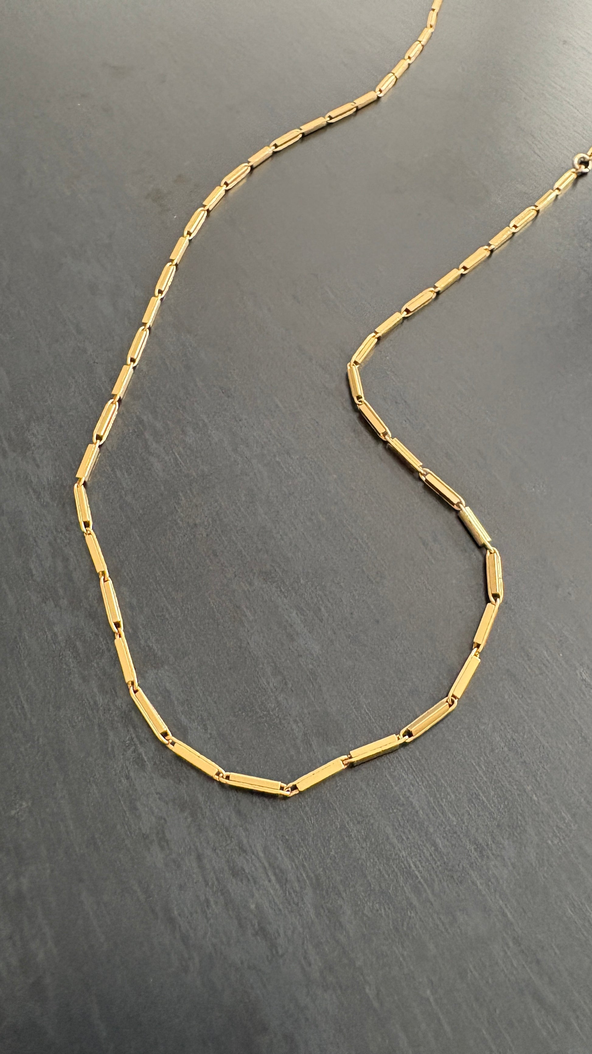 Chaîne en or composée de fines barres allongées reliées entre elles. Son éclat lisse et raffiné lui confère une allure élégante et intemporelle. Un design simple mais plein de présence, qui se porte aussi bien seul qu’en superposition avec d’autres colliers.