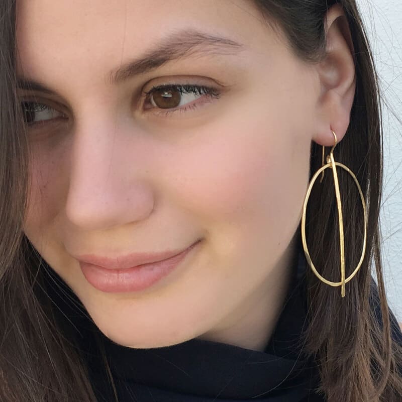 大きなサークルの真ん中に一本線が入ったオリジナルなデザインのピアス。大ぶりでちょっと面白いデザインが好きな方に。